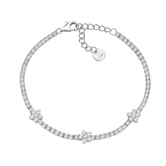 Bracciale tennis in argento 925 rodiato con zirconi bianchi da 2 mm ed elementi a forma di fiore da 6 mm. Lunghezza regolabile da 16 a 19 cm con catenina di allungo e chiusura a moschettone.