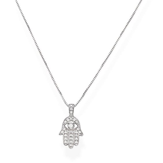 Collana Amen in Argento 925‰ rodiato e zirconia bianca. Lunghezza collana 42cm, lunghezza pendente 1,5cm.