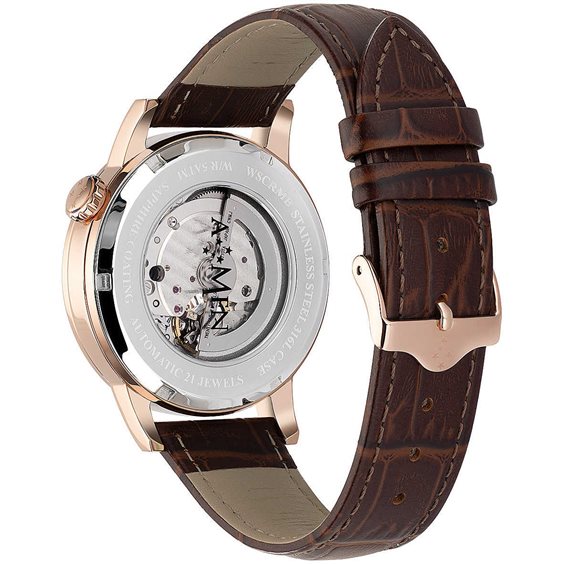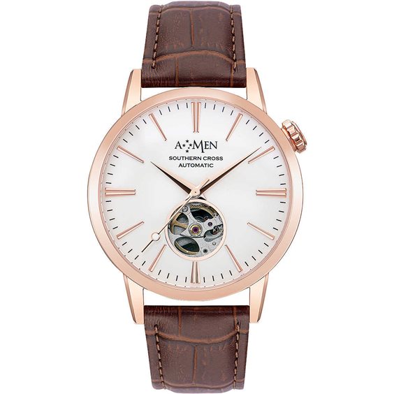 Orologio Solo Tempo Da Uomo Della Collezione Southern Cross Di Amen. Orologio Solo Tempo Con Cassa Realizzata In Acciaio 316L Con Finitura Rosè E Diametro Di 41Mm. Il Movimento È Meccanico. Numero Rubini: 24. Il Fondello È A Vite Con Oblò Trasparente Con Movimento A Vista. Il Vetro È Minerale Con Sapphire Coating. Il Cinturino È In Pelle Di Colore Marrone Con Fibbia Ad Ansa Fissa. Il Quadrante È Analogico Di Colore Bianco. La Resistenza All'Acqua È Di 5 Atm.