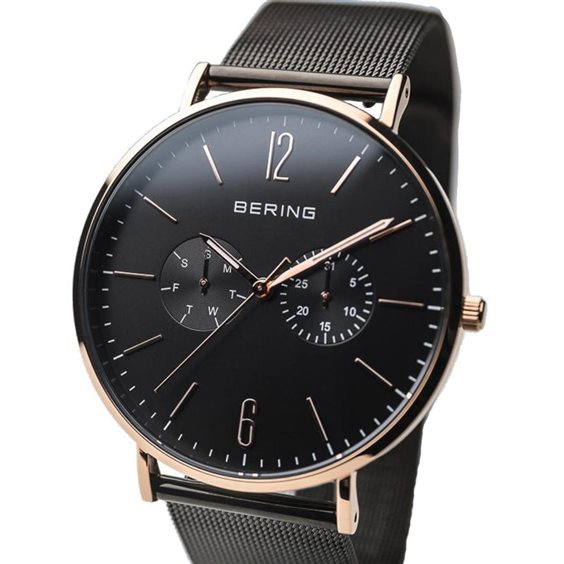 Cassa in acciaio inox laminato oro rosa, quadrante nero con due contatori day-date, diametro mm.36, vetro zaffiro, impermeabilità 3 atm, garanzia 3 anni.