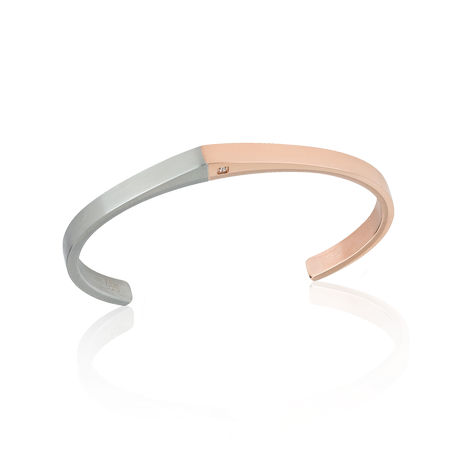 Bracciale rigido in acciaio satinato e rosè, con possibilità di incidere quello che si desidera. Tagli S 54 mm