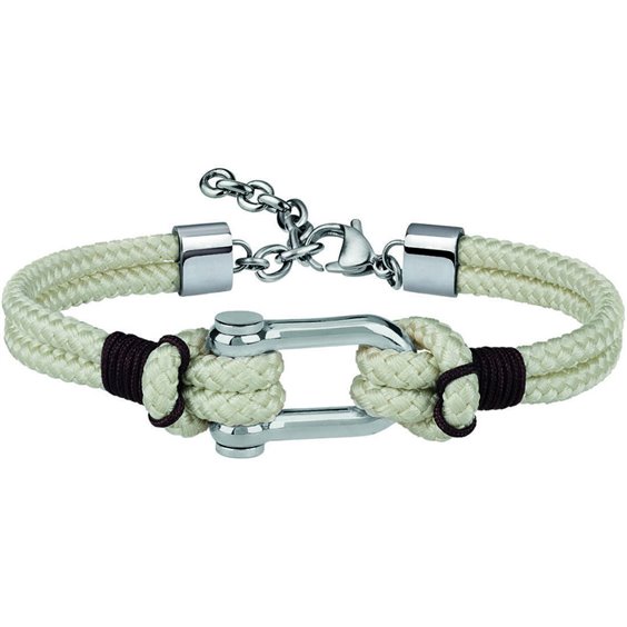 BRACCIALE IN ACCIAIO E STOFFA COLORE PANNA E MARRONE CON CHIUSURA A MOSCHETTONE E CATENELLA PER REGOLARE MISURA.