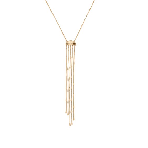 Tutte pazze per le frange! La collana da donna Sinuous è realizzata in acciaio Ip gold ma mostra una leggerezza senza precedenti. La sua costruzione permette un indosso originale “a cravattino”. In perfetta tendenza con la moda boho chic, sottili frange in acciaio creano strepitosi effetti di luce e riflessi. Lunghezza Minima 55CM Lunghezza Max 65CM