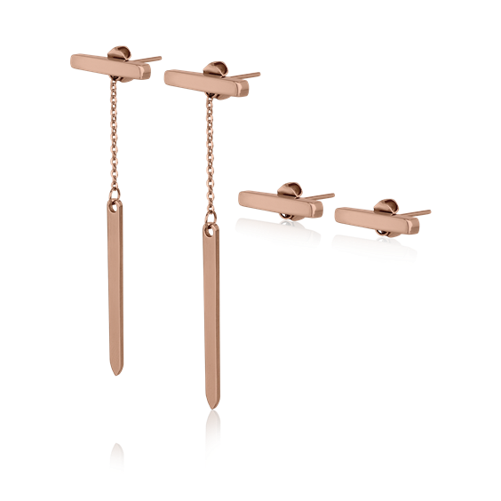 Orecchini in acciaio con trattamento IP rose dal duplice indosso: super minimal con barretta al lobo, oppure abbinata al pendente.