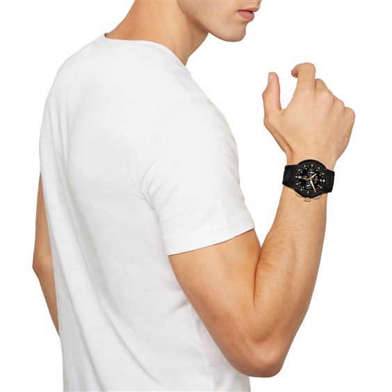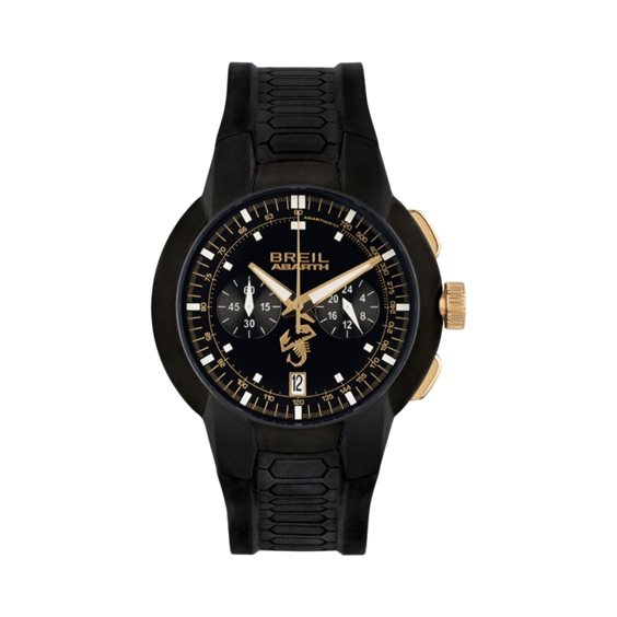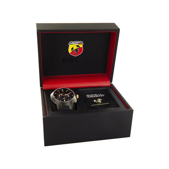 Il cronografo Breil Abarth trae ispirazione dalla serie speciale Abarth 595 Scorpione oro, da cui eredita dettagli e colorazione. La livrea nera opaca che caratterizza l'auto ritorna anche sull'orologio e, abbinata ai dettagli oro del quadrante, di pulsanti e corona, ne evidenzia il carattere e la potenza. Non poteva mancare lo scorpione, in versione oro a ore 6. L'orologio è prodotto in edizione limitata di 2.000 esemplari, con numerazione sul fondello.