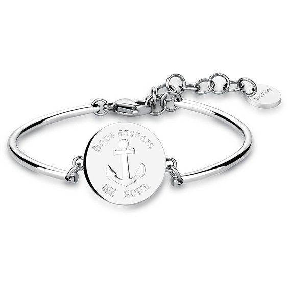 Bracciale Brosway da donna collezione Chakra. Realizzato in Acciaio 316L. Piastrina centrale con incisa un Ancora (che rappresenta sicurezza, speranza ed Quilibrio) e la scritta 'Hope anchors my soul' (La speranza è ancorata all'anima).