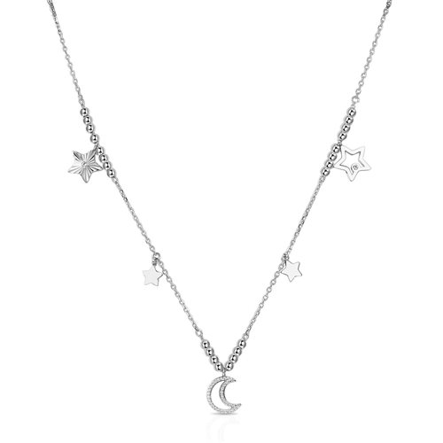 Collana in acciaio 316L con pendenti a forma di stelle e luna, sfere in acciaio e cristalli Swarovski©Elements.Misura Collana 410mm