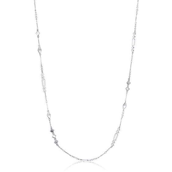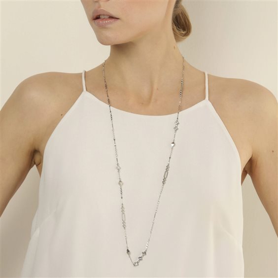 Collana long island lunga in acciaio 316L con dettagli square chain, cristalli round e baguette swarovski.