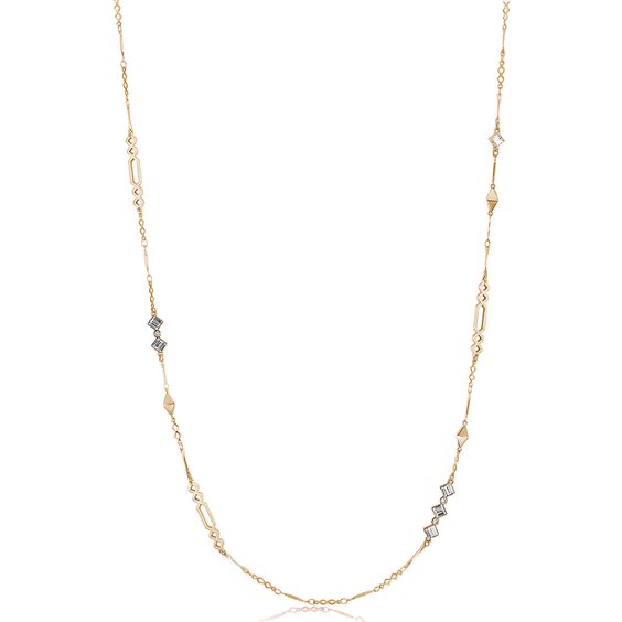 Collana long island lunga in acciaio 316L e finitura oro rosa con dettagli square chain e cristalli baguette swarovski.