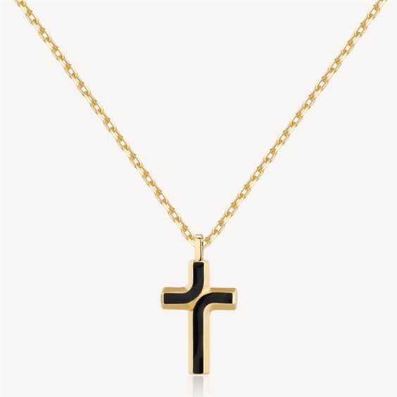 Collana in acciaio 316L, finitura color oro, pendente a forma di croce e smalto nero.