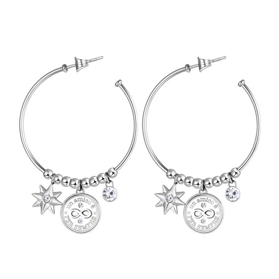NCISIONE: Un amico è per sempre(fronte) Per tutto il tempo e le risate insieme, per tutti i pianti e le confessioni reciproche, per le nostre litigate e le riappacificazioni, per la nostra complicità di cui non potrei mai fare a meno… per te che sei la migliore amica che potessi desiderare! Orecchini a cerchio grandi in acciaio 316L con pendente con infinito e a forma di stella polare con cristalli Swarovski©.