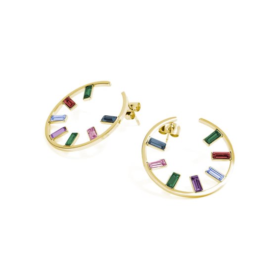 Orecchini a cerchio in acciaio 316L e pvd oro con cristalli Swarovski©montana, light rose, emerald, amethyst, aquamarine e scarlet.