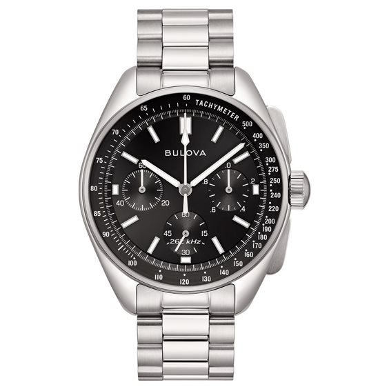Orologio Bulova 96A299 Lunar Pilot cronografo con quadrante nero monocromatico con dettagli in bianco per scala tachimetrica e contatori, diametro cassa 43,5 mm. e spessore 13,21 bracciale in acciaio a tre maglie finitura lucida e satinata con chiusura a scomparsa deployante, vetro zaffiro piatto, resistente all'acqua 5 bar.