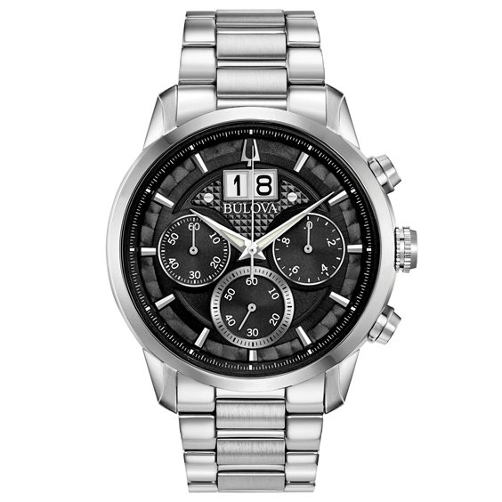 Orologio multifunzione da uomo di Bulova della collezione sutton. Orologio con cassa in acciaio del diametre di 44 mm e quadrante con indici a tacche. Cinturino in acciaio di colore e chiusura deployante. Movimento al quarzo, cronografo e gran data ore 12 e resistenza all'acqua di 3 atm. La referenza è 96b319