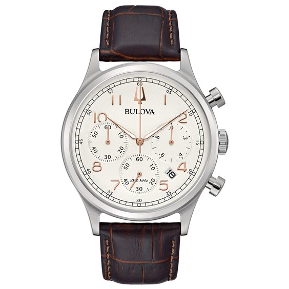 Orologio Crono Da Uomo Di Bulova, Della Collezione Classic. Orologio Con Cassa In Acciaio Di Dimensioni 43 Mm. Orologio Con Cinturino In Pelle Finitura Coccodrillo Di Colore Marrone E Chiusura A Fibbia Ardiglione. Orologio Cronografo A 6 Lancette Con Indici In Numeri Arabi, Movimento Al Quarzo Precisionist 262 Khz E Resistenza All'Acqua 3 Atm. La Referenza È 96B355