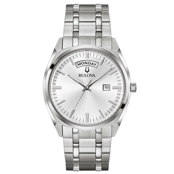 Orologio Solo Tempo Da Uomo Di Bulova Della Collezione Day Date. Modello Con Cassa In Acciaio 316L Del Diametro Di 39 Mm E Dello Spessore Di 10,3 Mm. Il Quadrante È Di Colore Silver, Con Indici E Sfere Silver Ed Apertura A Ore 12, A Mostrare Il Giorno Della Settimana. Modello Con Vetro Minerale E Bracciale In Acciaio 316L Con Chiusura Deployante.