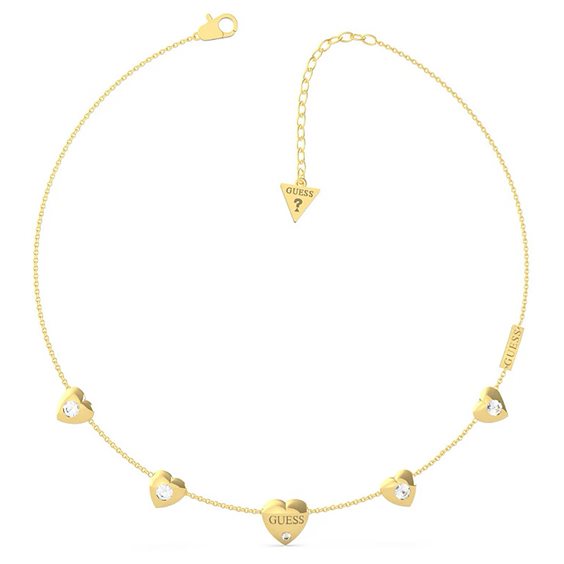 Collana Guess della collezione is for lovers. Gioiello realizzato in acciaio 316L dorato con ciondoli a forma di cuore, lunghezza 40cm. Collezione: Guess Is For Lovers Colore: Gold Materiale: Acciaio Occasioni: Compleanno, San Valentino Tipologia: A Catena