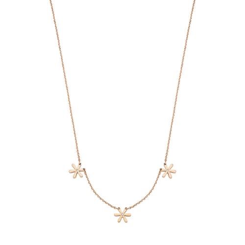 Collana in acciaio rosato con tre ciondoli a fiore e zircone centrale.