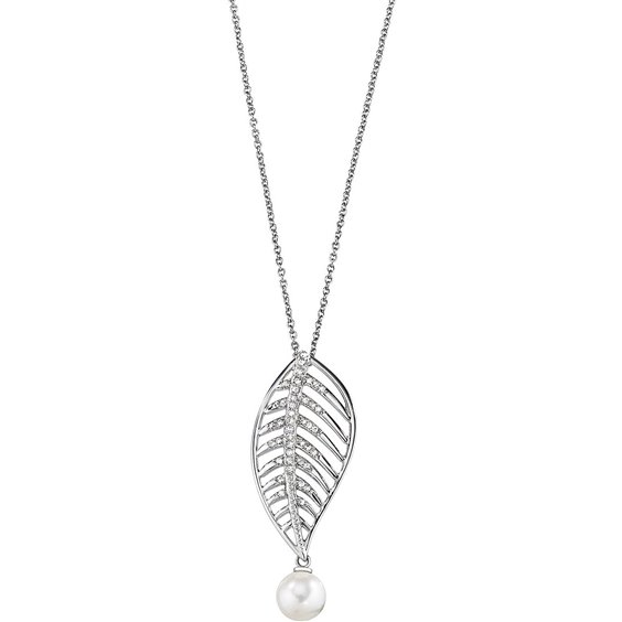 Collana donna in acciaio 316L , catena maglia rolò , girocollo lunghezza cm 45 regolabile fino a cm 40 , pendente a forma di foglia cm 4 , perla coltivata bianca , cristalli bianchi incastonati. Immagine indicativa , la confezione può variare di forma e colore.