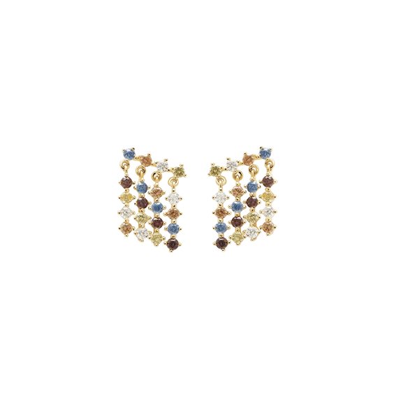 Orecchini in argento 925 con placcatura in oro 18kt. Pietre principali: Corindone Blu Zaffiro, Zirconi Rodoliti, Zirconi Champagne, Zirconi Giallo Oro, Zirconi Bianchi Puri.