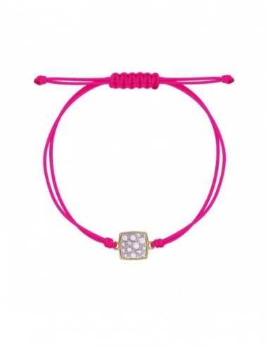 Bracciale con cordino in tessuto rosa e soggetto quadrato small pavè. Stardust TEN, la collezione dedicata a chi ama i gioielli realizzati con pavé di brillanti, da indossare in quantità per un effetto ultra luminoso. In questa evoluzione i gioielli acquistano più spazio e carisma, si aggiungono nuove forme e combinazioni. Si preannuncia una stagione ad alto tasso di scintille. Soggetto: quadrato Dimensione : soggetto 0,8 cm, cordino regolabile Finitura disponibile: Placcatura giallo 18kt e zirconi Materiale: Argento 925