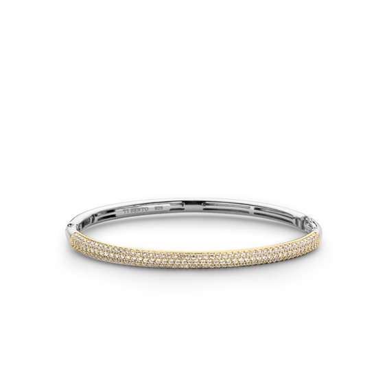 Bracciale rigido d'argento placcato oro TI SENTO - Milano è caratterizzato dal pavé di zirconi bianchi incastonato a mano in una montatura placcata oro. Il bracciale è realizzato in argento sterling 925 e placcato oro 18k.