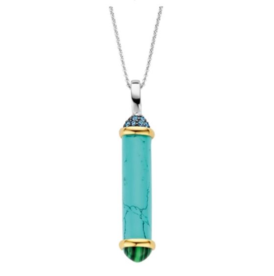 COLLANA IN ARGENTO 925% CON PLACATURA IN ORO GIALLO, ZIRCONI, MALACHITE E PASTA DI TURCHESE.
