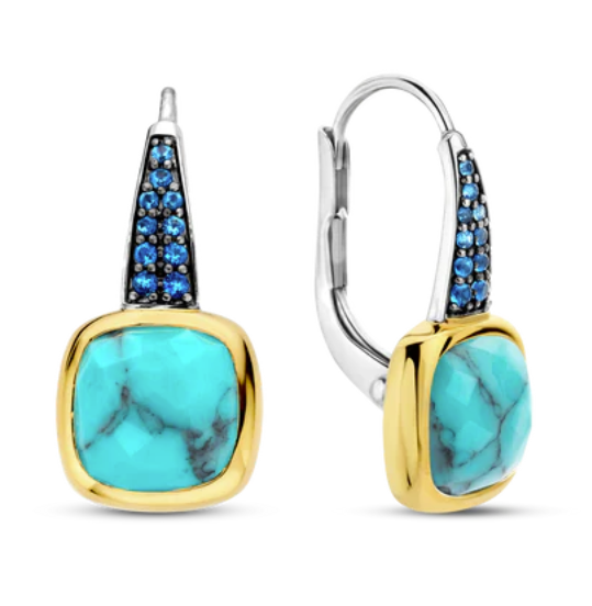 Orecchini in turchese su castone giallo e cubic zirconia blu