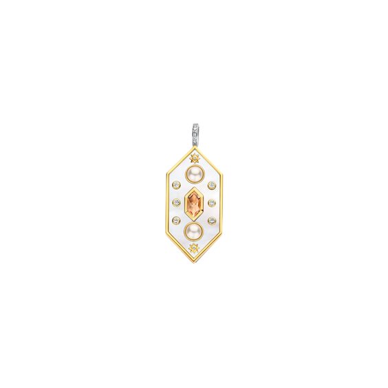 PENDENTE DI FORMA ESAGONALE ALLUNGATO CON AMPIA SUPERFICE IN MADREPERLA IMPREZIOSITA DA UNA PIETRA ROSA CENTRALE, CUBIC ZIRCONIA E 2 MEZZE PERLE SU BASE D'ARGENTO DORATO