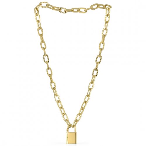 Collana di catena forzatina in bronzo, con chiusura centrale a lucchetto. Un accessorio moda, un'idea regalo in cui il lucchetto diventa protagonista. Lunghezza 42