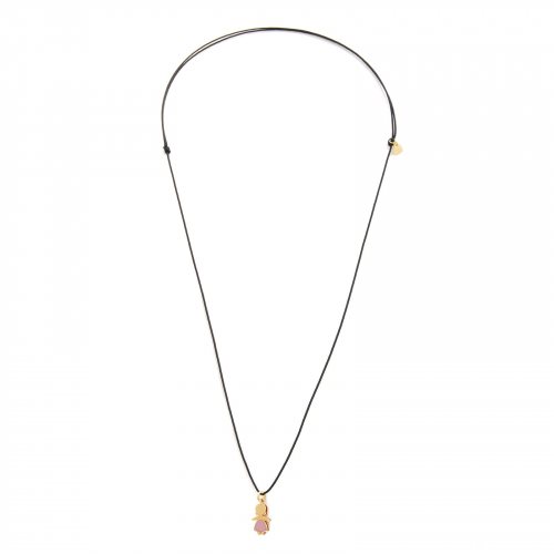 Pendente piccolo a forma di bimbo in oro 9kt con pasta di corallo rosa e cordino nero regolabile in poliestere riciclato. Un accessorio dall'eleganza giocosa e vivace che simboleggia con semplicità l'amore indissolubile per i figli e celebra la famiglia e la purezza dell'infanzia. Un dono piccolo e prezioso da portare sempre indosso come dolce portafortuna.